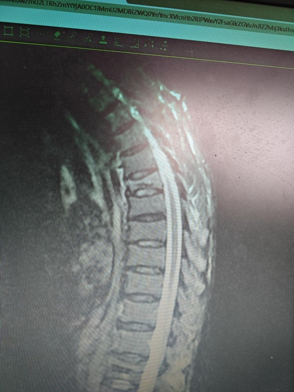 82岁的彭爷爷(化名)是一位地地道道的农民,平日在田土里劳作,生活惬意。然而一次意外跌倒导致他胸6椎体压缩性骨折,剧烈的背部疼痛还有胸部牵涉痛让他非常难受,咳嗽都痛,加上以前有肺心病,这段时间来彭爷爷行走活动差,吃不下饭,连去菜园活动都成了奢望。经检查,彭爷爷被确诊为“胸椎T6节段压缩性骨折”,保守治疗收效甚微,家人慕名来到我院寻求进一步治疗。