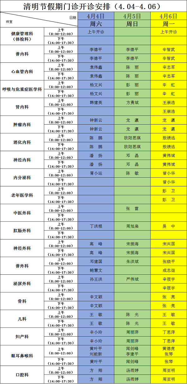 我院为无节假日医院,为方便您提前了解我院门诊排班情况,合理安排就诊时间,现将我院2026年清明节门诊排班公示如下。