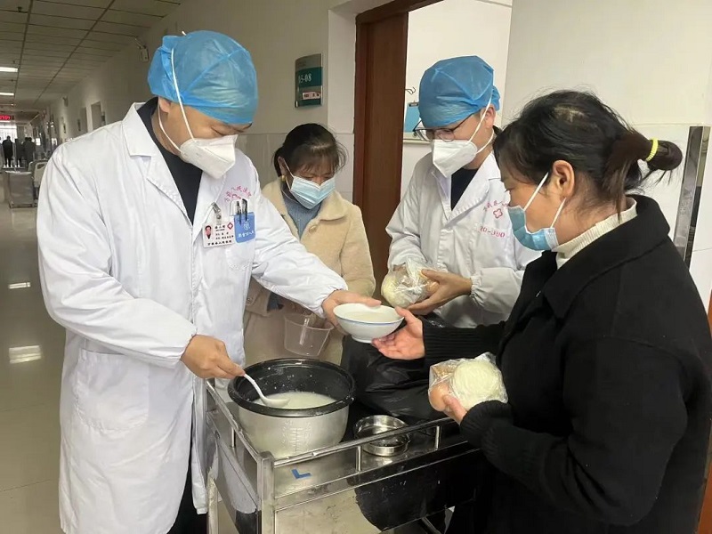 为方便患者,消化内科、心血管科医护人员利用自己储备的物资,熬制白粥,免费送给病人喝。暖心的一幕幕出现在病房中,让病人及家属感受到温暖与关怀。