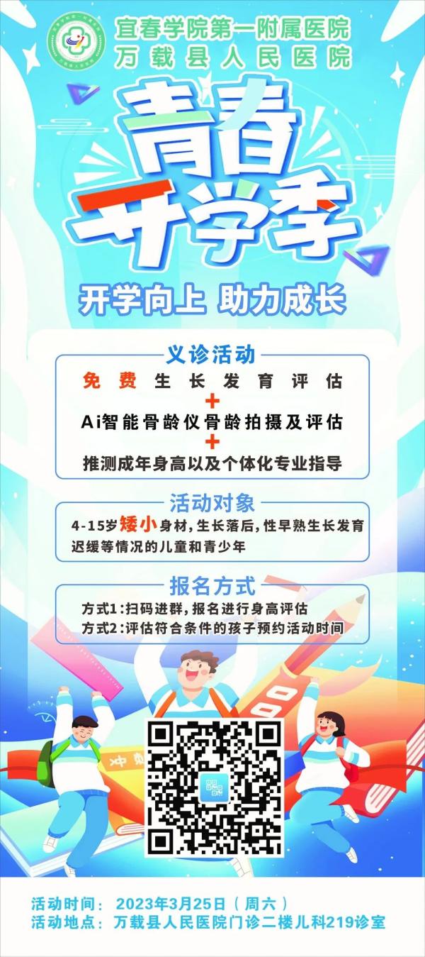 为了让儿童健康快乐地成长,帮助家长解决孩子成长道路上的种种困扰,宜春学院第一附属医院 (万载县人民医院)儿科将举办“春季开学长高季”儿童生长发育义诊活动。