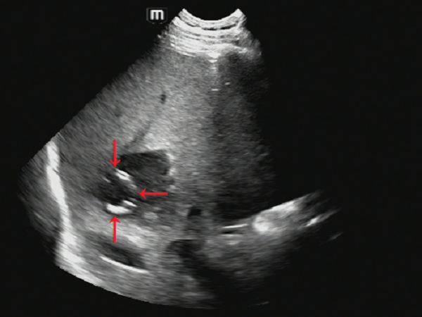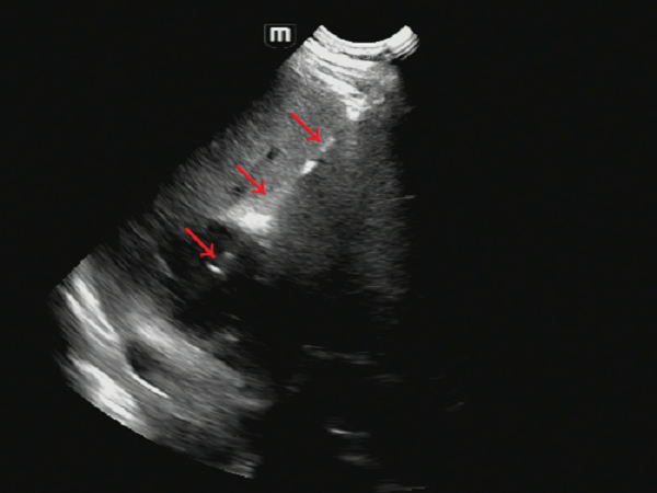 超声所见:肝多发脓肿,其中已完全液化较大者位于右肝前叶上段(图1),故拟行经皮右肝前叶上段脓肿穿刺置管引流术。