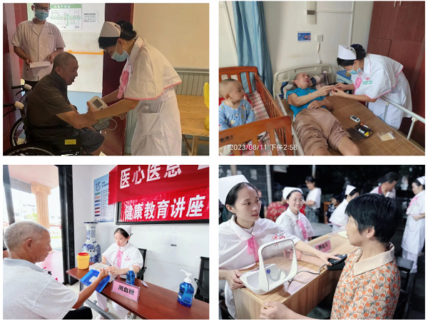 在学员们实操的同时,我院南丁格尔志愿服务队来到老年公寓,耐心询问和聆听老人身体情况,为老人们测量血压、血糖等,并给出专业健康指导。