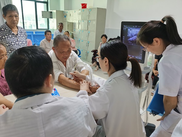 义诊现场,前来就诊的群众络绎不绝,博士团及各专家们耐心看诊的同时也向现场的群众普及疾病知识,传播早筛查、早预防、早诊治的健康理念,增强群众自我发现疾病及自我保健意识,并向前来咨询就诊的患者提供免费超声检查、测血糖、测血压以及尿毒症患者血管超声检查等,免费发放药品及健康宣传资料,并送上中秋月饼和节日的祝福。