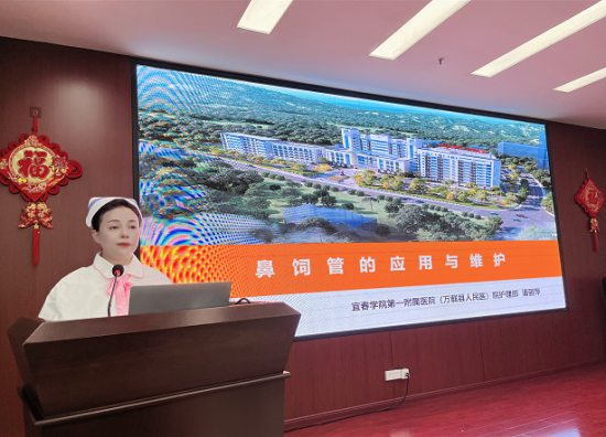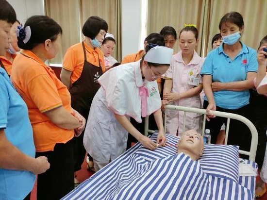 为更好做好老年患者关怀服务和介护培训等工作,提高医院护工的照护技能,护理部主任潘丽萍组织医院各科室护工及家属开展健康培训,讲解鼻饲管的运用与维护知识以及组织现场实操训练,由医院南丁格尔队进行一对一指导掌握要领,提升医院护工们护理水平。同时,本次培训还对学习认真、表现良好的护工发放礼品,大大增强大家的参与积极性。