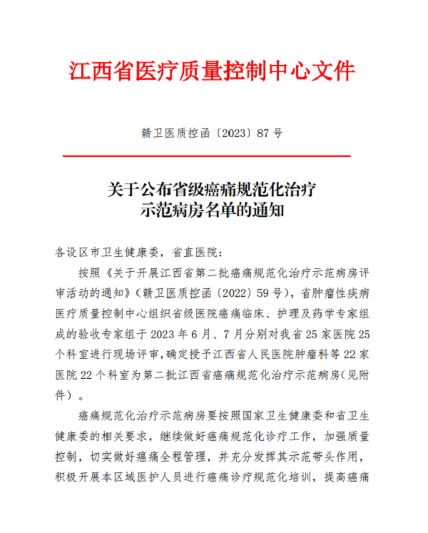 近日,江西省肿瘤性疾病医疗质量控制中心公布了江西省癌痛规范化治疗示范病房名单,我院肿瘤科(原内三科)被评为“江西省癌痛规范化治疗示范病房”!