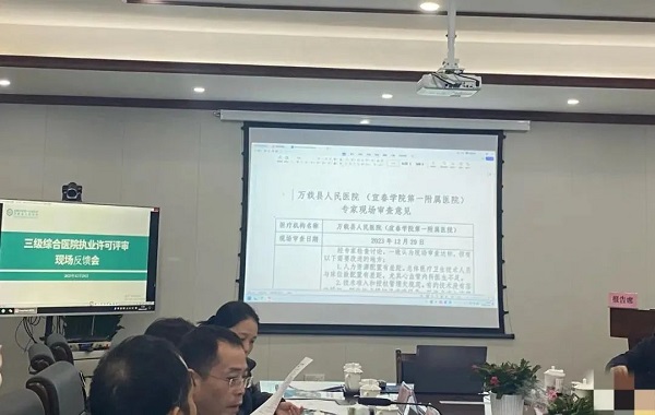 现场检查后召开了评审反馈会。评审专家组组长对此次评审结果进行了全面反馈,宜春市卫健委医政医管科科长葛多云进行了总结讲话,现场宣布:宜春学院第一附属医院 万载县人民医院已通过三级综合医院执业许可现场评审验收。