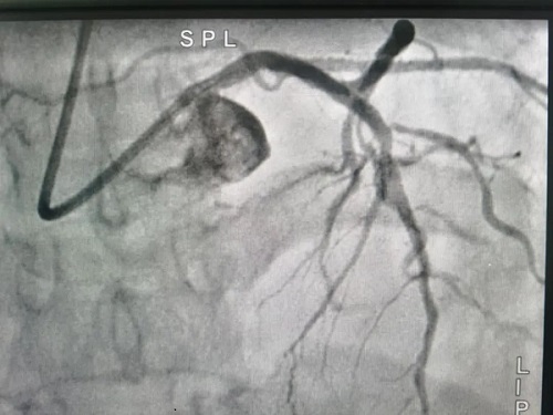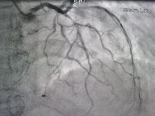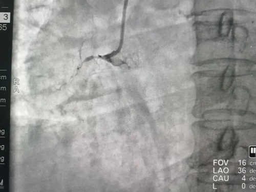 患者龙某,女,59岁,因胸痛2天加重2小时入院,2024年3月9日冠状动脉造影示左主干正常,前降支近中段长斑块,狭窄90%,TIMI血流3级,可见逆向血流至右冠远端;高位钝缘支可见散在斑块,狭窄80-90%,TIMI血流3级;右冠开口发出后完全闭塞,TIMI血流0级。
