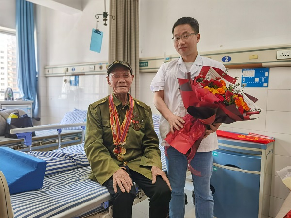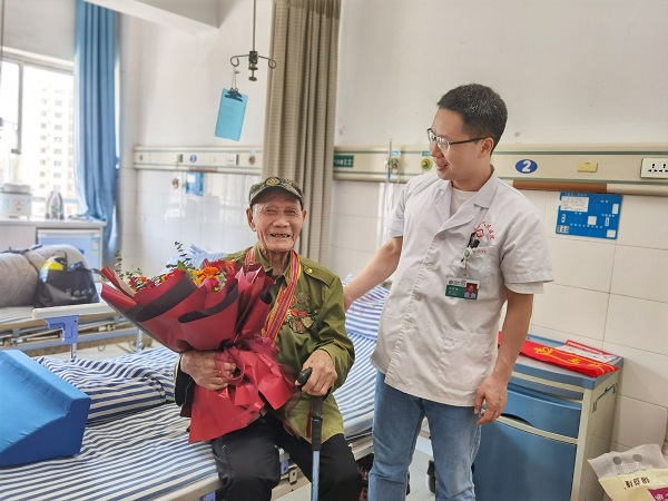 这是一位特殊的患者,据悉,老爷爷19岁参军,是参加过抗日战争、解放战争、抗美援朝战争的老兵,平日里,他喜欢穿上红军的服装,把珍贵的勋章挂在胸前,看着新时代的白衣天使,老人笑得像个孩子。