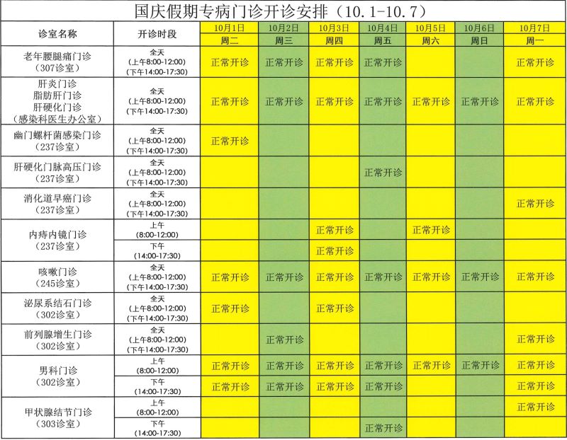 国庆节专科门诊开诊安排