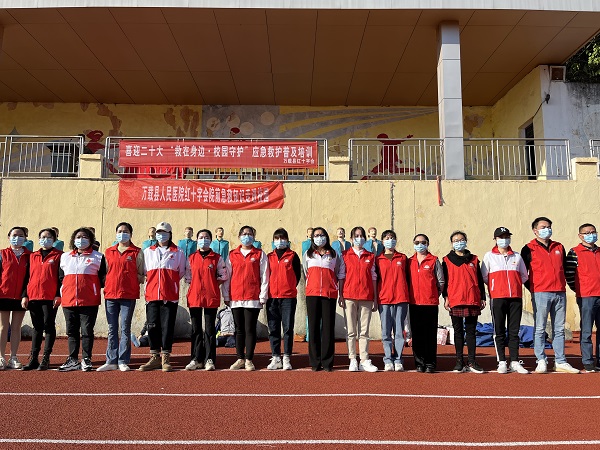 为普及急救知识与技能,提高安全意识,使学生们能在校园突发事件中运用相应知识与技能,进行迅速准确的救护。10月14日下午,万载县人民医院红十字会组织16名志愿者来到万载中学开展“喜迎二十大 院前急救知识进校园”活动,为2000余名高一新生开展急救知识科普及操作培训。