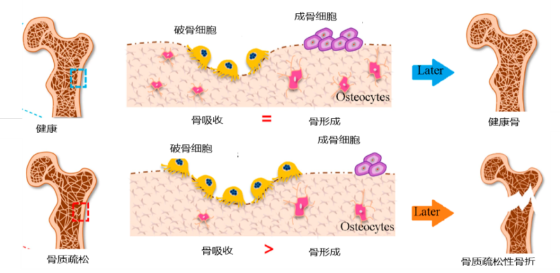 人体骨骼内有成骨细胞和破骨细胞在工作,稳定的骨转换维护着骨骼的致密结构。当破骨细胞活性大于成骨细胞活性时,骨转换失衡,这是引起骨质疏松症的主要原因。