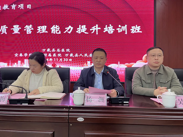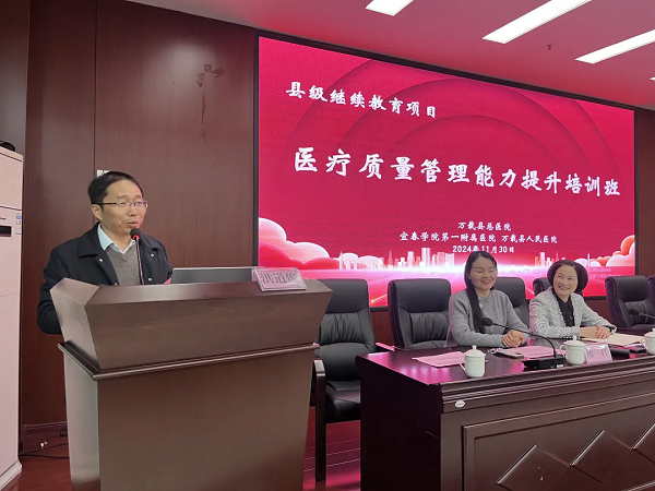 万载县总医院院长、人民医院院区党委书记许玮予以开班致辞。对南昌大学第一附属医院洪道俊教授一行牺牲休息时间下沉基层亲临万载传经授道表示欢迎和衷心感谢!对这几年一直派驻博士团到人民医院予以帮扶指导表示感谢!她简要介绍了总医院和人民医院院区的基本情况,并希望通过此次系统性专题培训后,能进一步提升质量意识,压实各级质量管理责任,全面掌握和充分运用质量管理工具和方法,推动医疗质量管理形成闭环、医疗质量水平螺旋式上升,打造有温度的医疗质量文化,不断提升群众看病就医的获得感、幸福感、安全感。