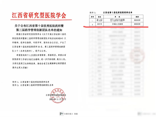 近日,2024年江西省临床药师学术大会在南昌召开。会上,江西省研究型医院学会公布了江西省第十届优秀医院药师名单。该奖项旨在表彰和鼓励在医院药学岗位做出突出成绩的医院药师。此次评选经过层层筛选和严格评审,向社会公示等环节,我院药学部黄开华榜上有名,荣获江西省第十届“优秀医院药师”荣誉称号!