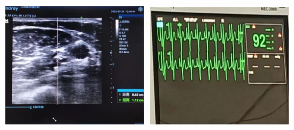 患者丁女士,今年56岁,卵巢癌术后3年复发一年余,为行化疗入住我科(肿瘤内科)。为了保护静脉,避免药物外渗,顺利完成化疗周期,经肿瘤科护士长姚志英带领的 PICC 小组充分评估后,拟经右侧上臂贵要静脉行 PICC 置管术,8月8日,姚志英护士长及专科护士龙灵在超声引导下成功完成首例B超引导下 PICC 置管。术中出血少、患者疼痛感较轻,导管尖端位于上腔静脉,无置管并发症发生。置管成功后,患者及家属表示非常满意。
