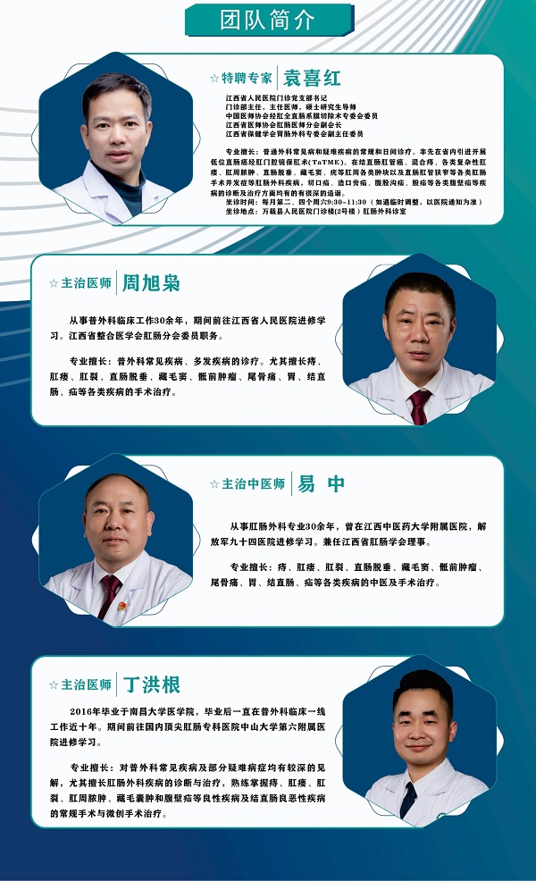 宜春学院第一附属医院 万载县人民医院肛肠外科(中西医结合)成立于1932年,病区开设床位35张,医护人员17人,主任医师(特聘专家)1人,主治医师4人,主治中医师1人。科室依托医院的综合实力,具有肛肠外科先进的诊断、治疗设备和仪器,可完成直肠肛门外科检查。可完成常规开放手术,腹腔镜手术,TaTEM手术(经肛门微创手术),开展中西医结合特色诊疗服务。可收治肛肠疾病病种县域内最多,病情最复杂。包括结直肠肛管恶性肿瘤,痔疮、肛瘘、肛周脓肿、直肠脱垂、直肠前突、直肠阴道瘘、直肠息肉、骶前肿物、便秘、藏毛窦、疣等良性疾病以及直肠肛管狭窄等各类肛肠手术并发症。