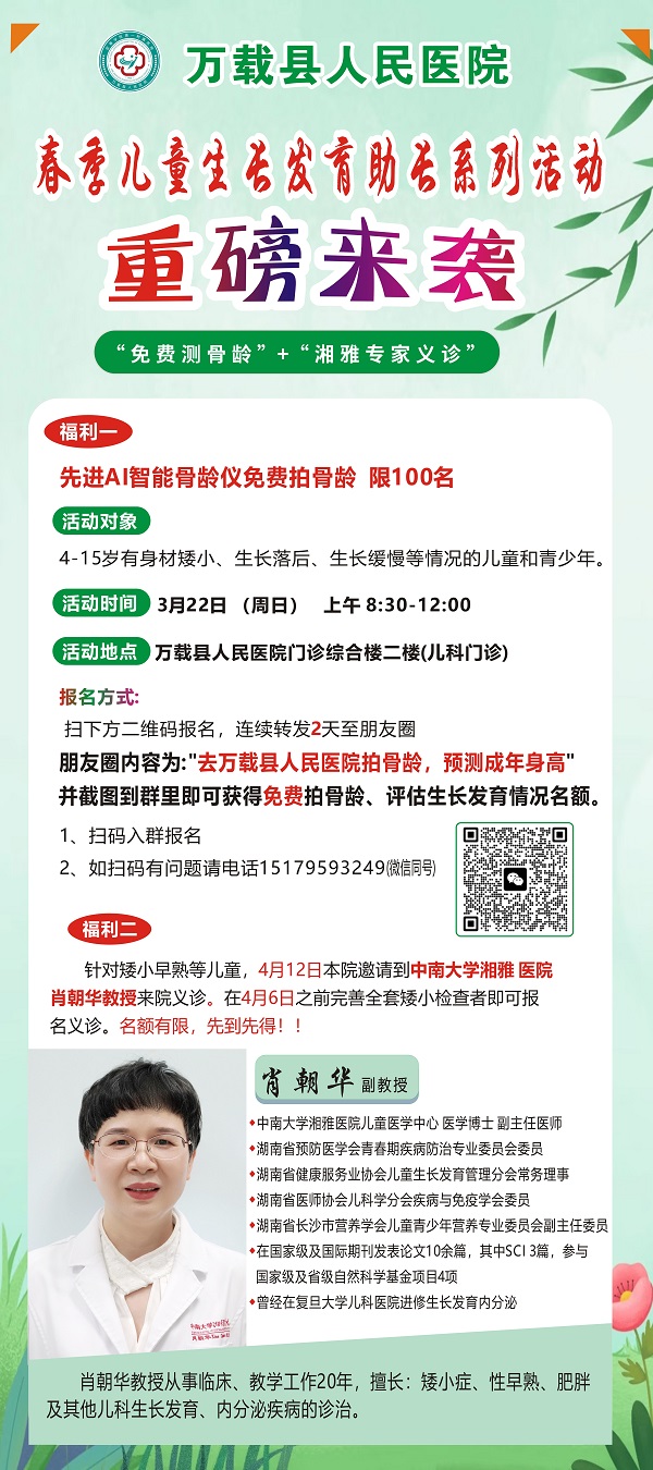 扫下方二维码进群,连续2天转发本链接并配文“去万载县人民医院免费拍骨龄,预测成年身高",并截图到群内,以此获得报名资格。