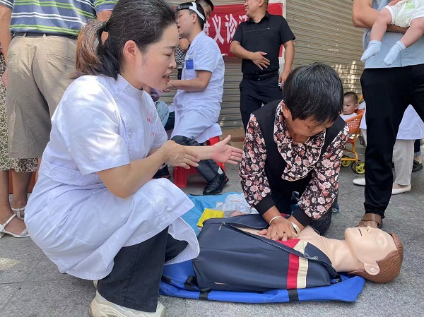 同时,我院医护人员利用人体模型进行操作演示,为卫生院医务人员及现场群众进行现场示范,指导群众开展实践演练,帮助群众掌握胸外按压、开放气道、人工呼吸、海姆立克急救、简单外伤包扎止血等急救技能。