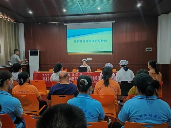 9月底,我院心血管科及老年科护理人员走进万载县颐康护理院送健康宣教,心血管科护士长杨明慧向护理院全体工作人员讲解了鼻饲并发症的预防与护理相关知识;南丁格尔志愿服务队队员利用模拟人进行现场教学、指导实践,有效提升护理院员工护理能力和服务水平;老年医学科护士长魏德华带领队员们为老人们测量血压、血糖、讲解宣传手册等,给予老人专业的健康指导。