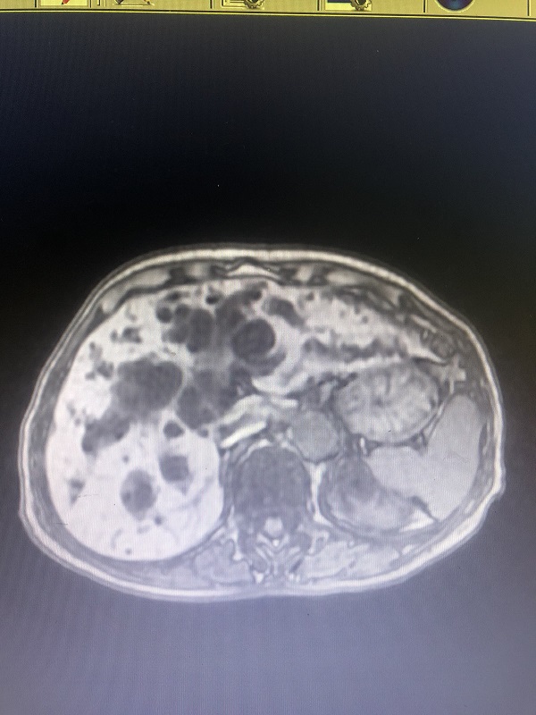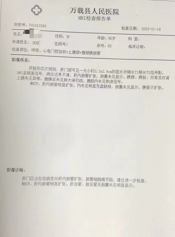 患者袁某是一名86岁的女性,因“无痛性黄疸20余天”入院。辅助检查,肝功能示:黄疸极为严重,低蛋白血症;上腹部MRI+MRCP示:肝门区占位性病变并肝内胆管扩张,胆管细胞癌可能;MRCP:肝内胆管明显扩张。