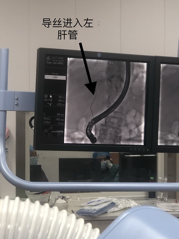 于2023年11月14日在全麻下行ERCP,术中可见胆总管狭窄严重,经多次努力,胆道支架经胆总管置入左肝管,但由于肿瘤侵犯致右肝管完全闭塞,胆道支架无法置入右肝管,引流效果欠佳。
