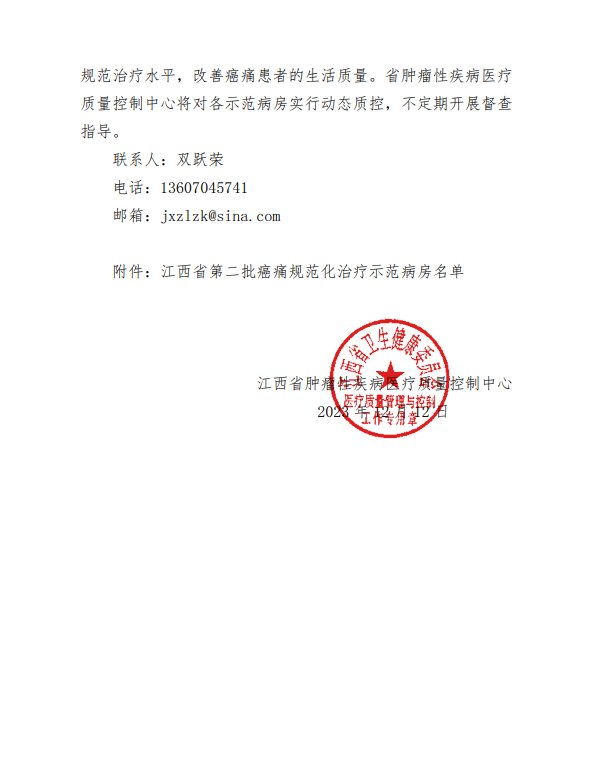 近日,江西省肿瘤性疾病医疗质量控制中心公布了江西省癌痛规范化治疗示范病房名单,我院肿瘤科(原内三科)被评为“江西省癌痛规范化治疗示范病房”!