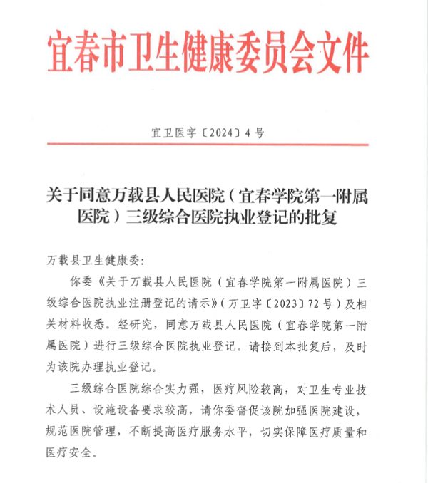 2月5日,宜春市卫生健康委员会下发《关于同意万载县人民医院(宜春学院第一附属医院)三级综合医院执业登记的批复》(宜卫医字〔2024〕4号),正式批复同意万载县人民医院(宜春学院第一附属医院)三级综合医院执业登记。