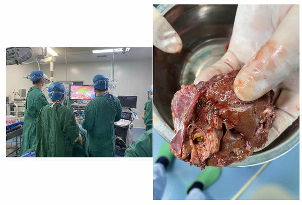 术中可见肝S5段表面肝脏稍萎缩,可触及条索状样结石,余肝脏、质地、色泽无明显异常,余肝脏未见明显异常,肝总管未见明显扩张。手术使用荧光腹腔镜联合术中超声明确肝S5段范围并标记、规则切除。术中切开肝S5段内胆管后未见明显脓性胆汁,取出数十粒直径约0.5cm-1.2cm结石后肝内胆管通畅,术中胆道镜检查未见明显结石残留。术后患者恢复良好,已顺利出院回家进行进一步康复治疗。