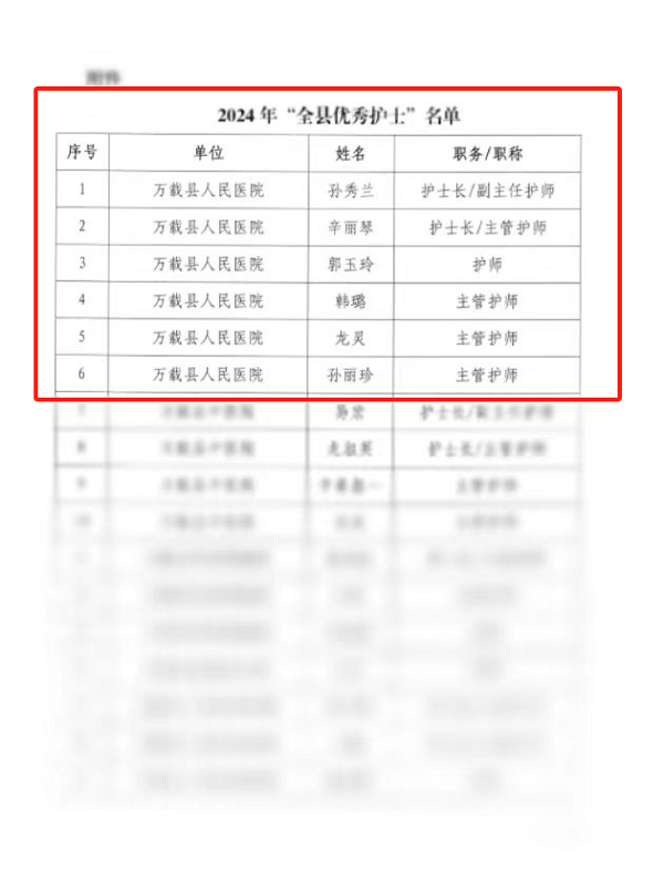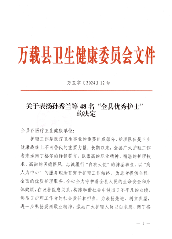 近日,县卫健委下发了《关于表扬孙秀兰等48名“全县优秀护士”的决定》文件,我院6名护理工作者受到表彰!