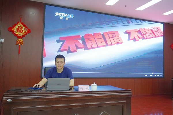 医院纪检监察室主任周斌带领大家观看案例警示教育片