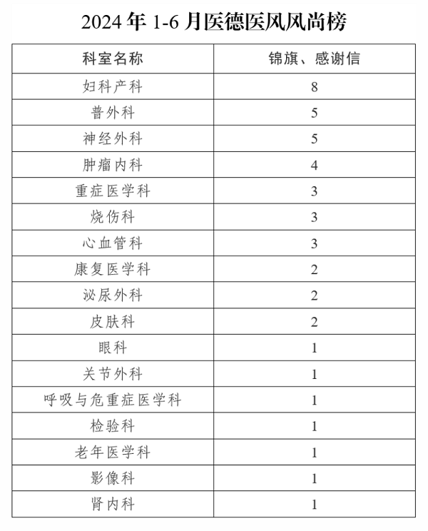 为进一步营造和弘扬崇德尚廉、无私奉献的良好风尚,推进勤廉医院建设,医院纪检监察室将在医院公众号定期刊发医德医风风尚榜,希望全院干部职工树立正确的价值观,不断增强廉洁行医意识,共同营造良好的医疗环境。现将2024年1-6月医德医风风尚榜公示如下: