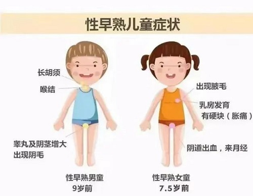 女孩7.5岁以前,男孩9岁以前出现第二性征的发育。一旦发生性早熟对孩子最直接的危害就是影响身高。性早熟的孩子会出现“早长早停”的现象,一般骨龄偏大,生长空间缩短,骨骺提前闭合,造成生长发育期提前结束,正常生长时间大大缩短。虽然现阶段时间内比同龄人高,但最终这部分孩子的身高反而会比发育正常的孩子矮。