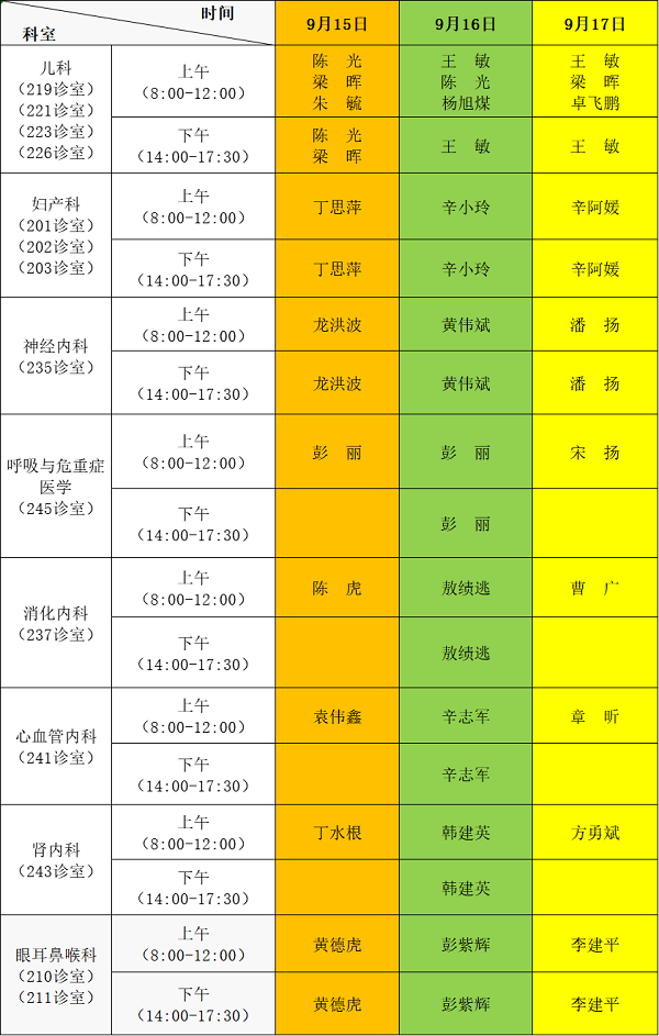 “中秋节”假期门诊排班表(9.15—9.17)