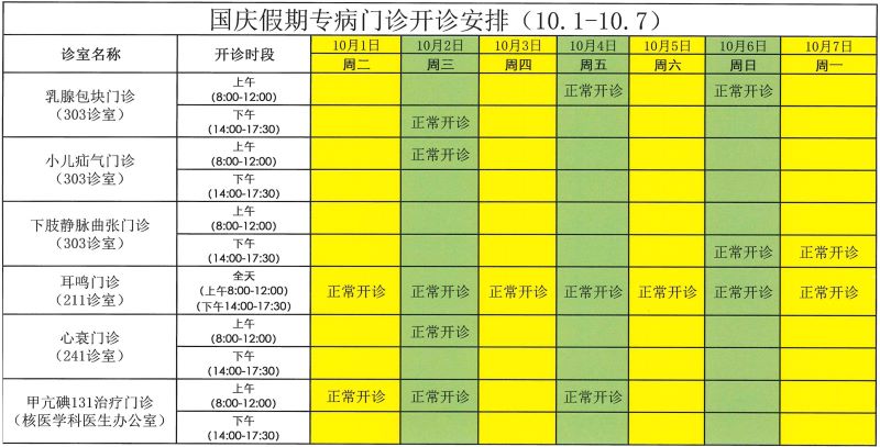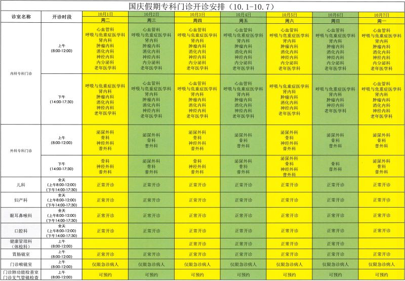 国庆节专科门诊开诊安排