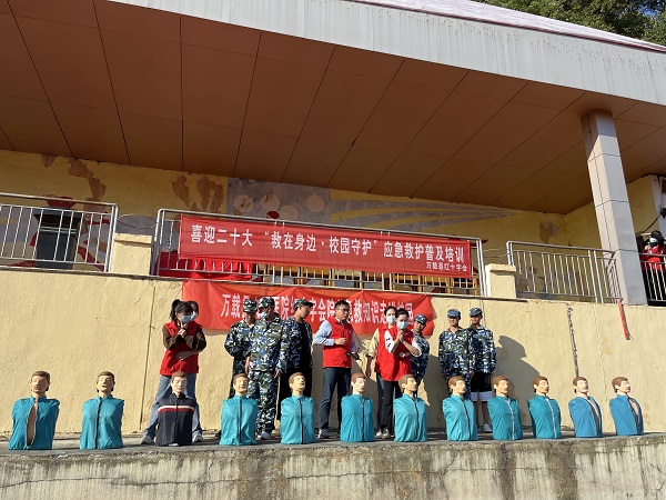 为普及急救知识与技能,提高安全意识,使学生们能在校园突发事件中运用相应知识与技能,进行迅速准确的救护。10月14日下午,万载县人民医院红十字会组织16名志愿者来到万载中学开展“喜迎二十大 院前急救知识进校园”活动,为2000余名高一新生开展急救知识科普及操作培训。