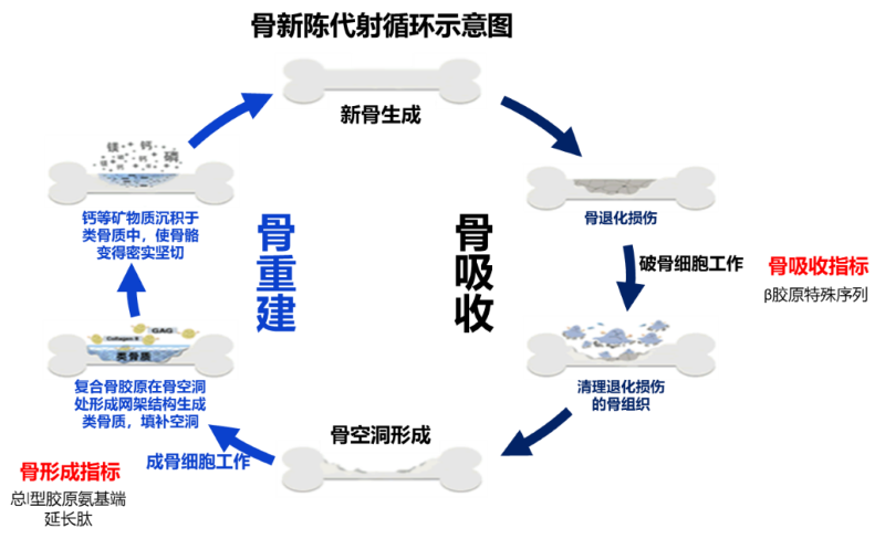 骨转换标志物(简称BTMs)是成骨细胞和破骨细胞过程中合成和分泌的代谢产物。其中破骨细胞代谢产物——骨吸收指标(β胶原特殊序列),成骨细胞代谢产物——骨形成指标(总I型胶原氨基端延长肽)。