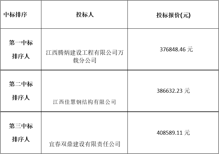 万载县人民医院钢结构连廊工程施工项目,于2023年12月7日下午15时00分在宜春学院第一附属医院-万载县人民医院外科楼11楼会议室举行邀请招标开标会,经评标委员会评审,现将中标排序前三名的投标人公示如下:
